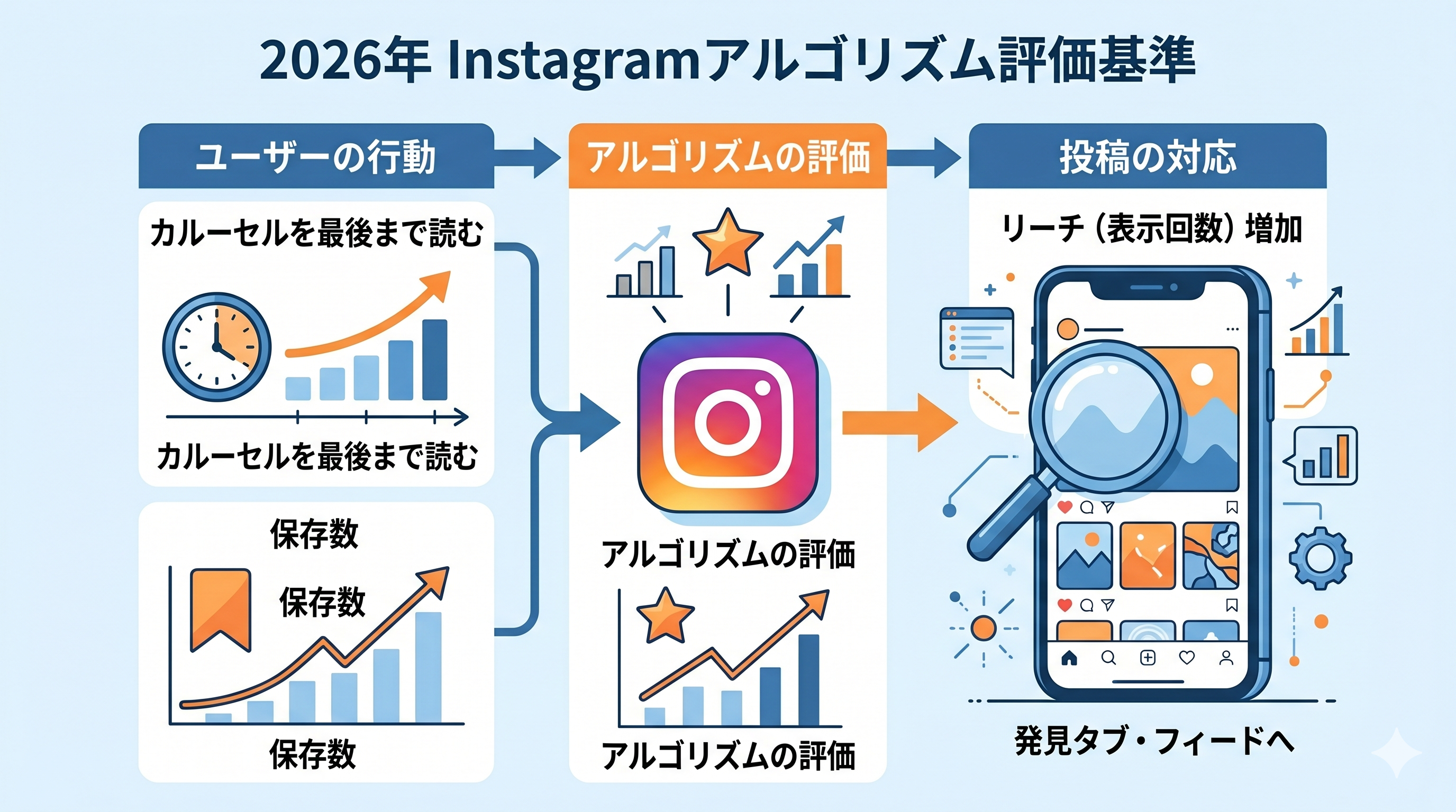 2026年のInstagramアルゴリズムは、単なる「いいね」の数よりも「滞在時間(その投稿が画面に表示されていた時間)」「保存数」を極めて高く評価します!