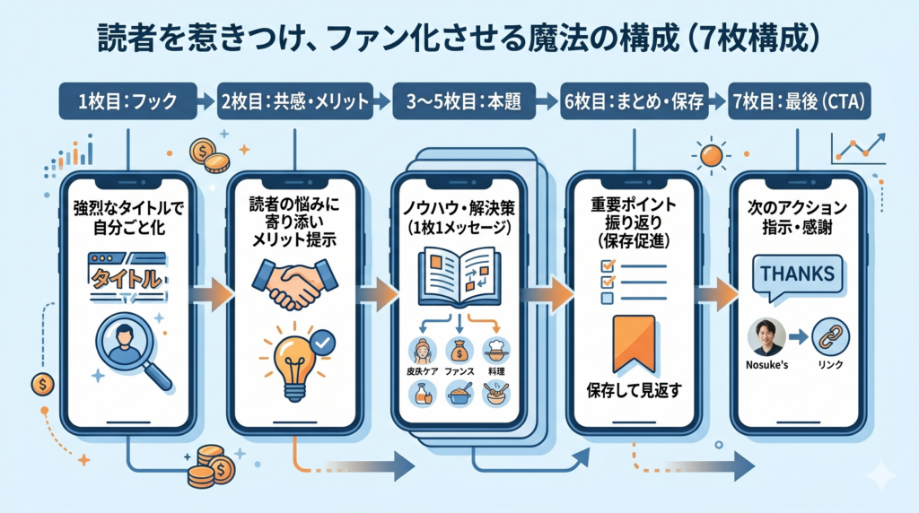 それでは、具体的な構成をお伝えします! カルーセルの枚数はテーマによって変わりますが、最もリズムが良く、離脱されにくい「7枚構成」の鉄板テンプレートをマスターしましょう!