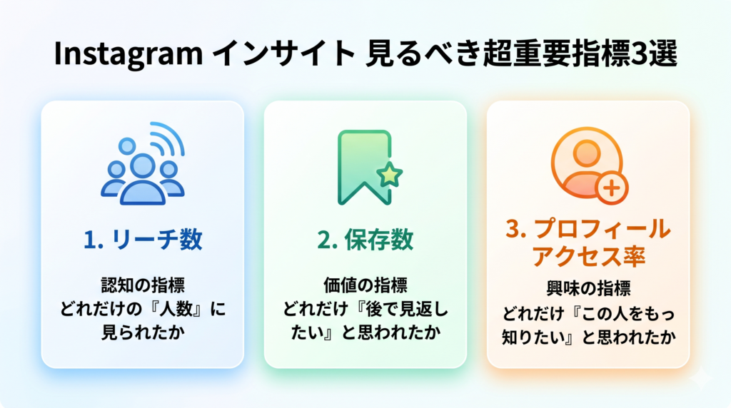 インサイトを開くと(※プロアカウントへの切り替えが必要です)、専門用語やたくさんの数字が並んでいて頭が痛くなりますよね。大丈夫です! 初心者が毎日チェックすべき数字は、実は以下の「3つ」だけです!