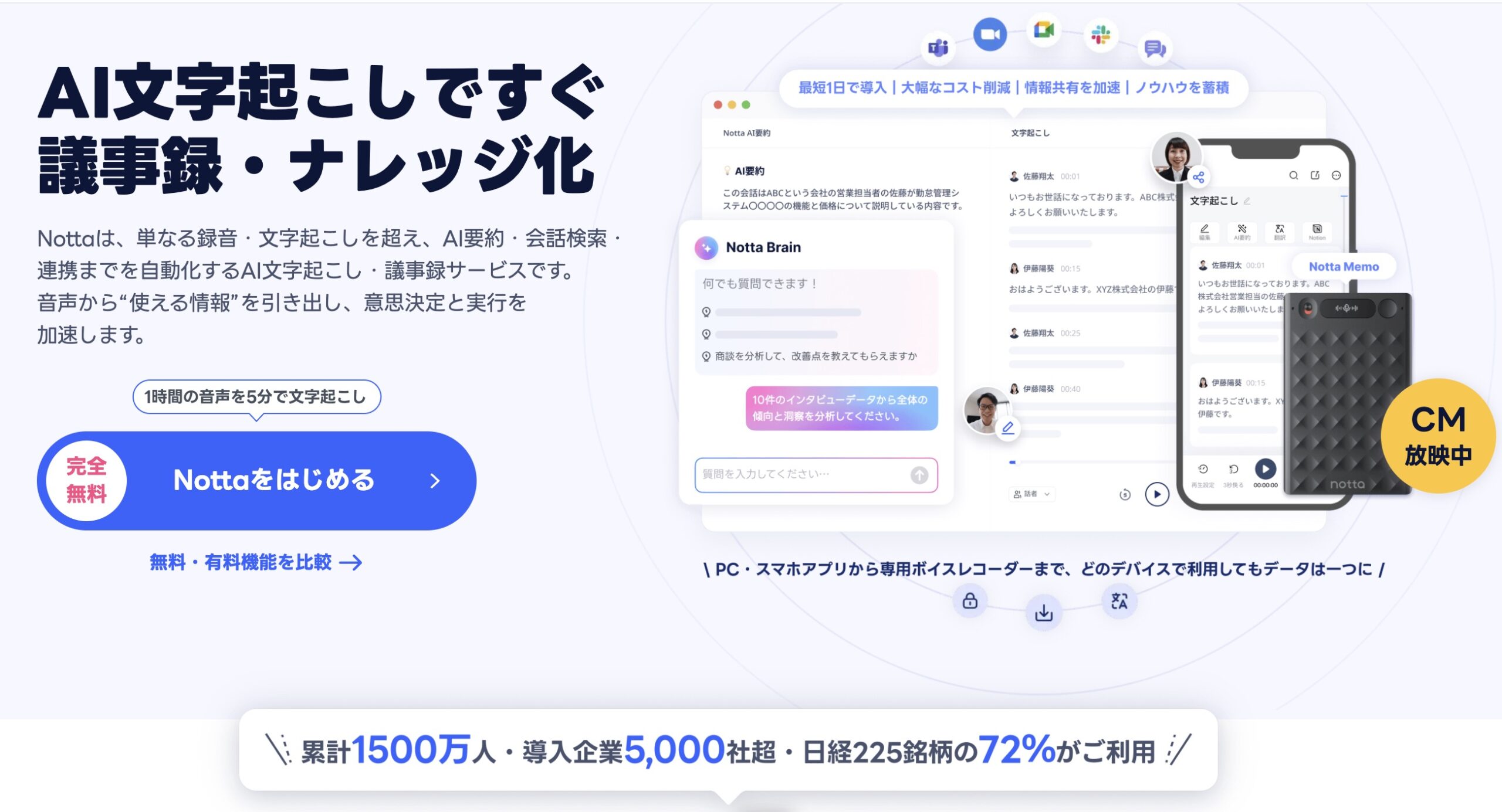 Nottaは、録音・文字起こしからAI要約、会話検索、共有までまとめて効率化できるAI文字起こしサービスです。会議後の議事録作成に追われる時間を減らし、決定事項やTodoをすぐに確認できます。n・AIが発言、決定事項、Todoを自動抽出n・リアルタイム文字起こしとAI要約に対応n・Zoom、Google Meet、Microsoft Teamsなどの会議にも活用可能n・無料プランあり、クレジットカード登録なしで試せるn・個人利用からチーム利用まで対応