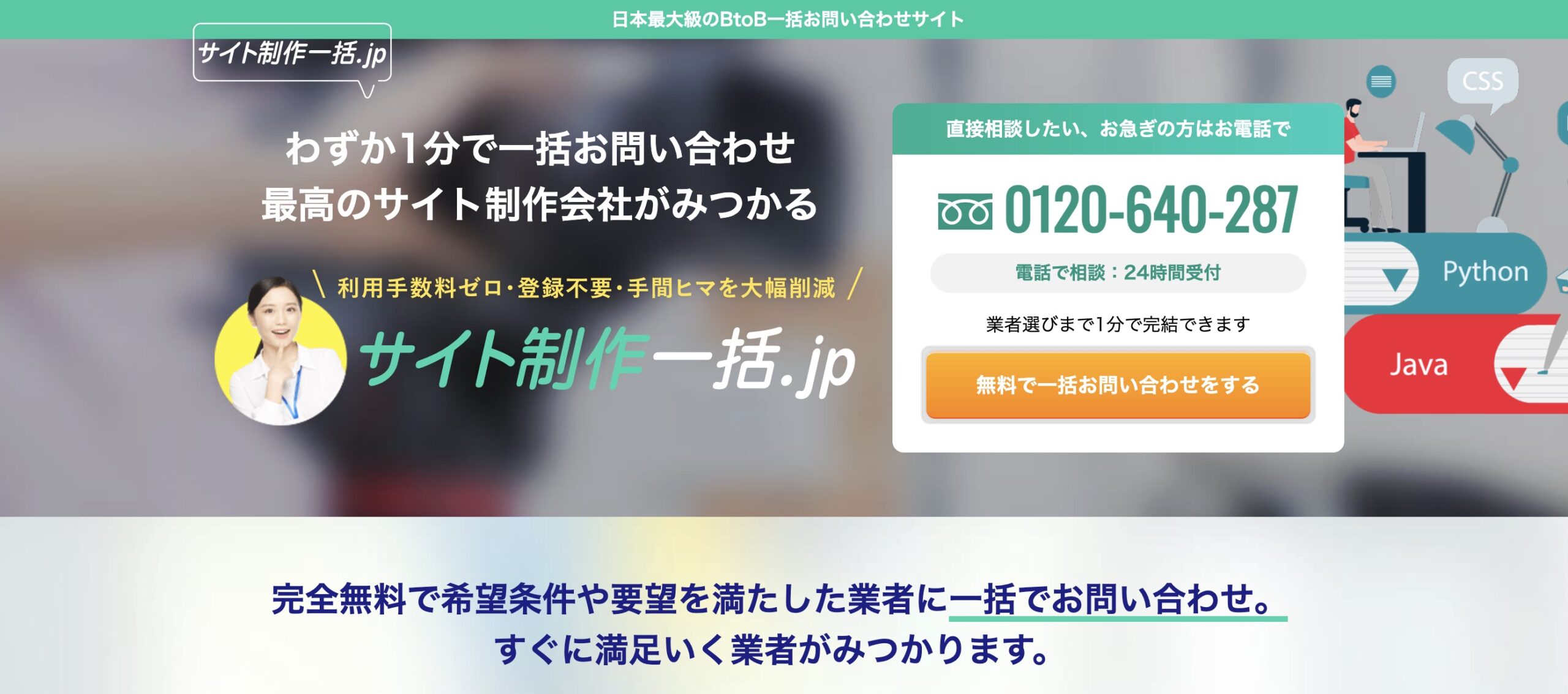 一括.jp サイト制作は、自社サイト・採用サイト・プロモーションサイト・ECサイトなど、目的に合う制作会社へ無料で資料請求できる比較サービスです。1社ずつ探して問い合わせる手間を減らし、予算や納期に合う会社を効率よく比較できます。n・条件に合う会社へ無料で資料請求n・自社サイト、リニューアル、採用サイト、ECサイト制作などに対応n・予算や公開希望時期に合わせて相談しやすいn・複数社を比較できるので相場感をつかみやすいn・フォーム入力で問い合わせをまとめて進められる